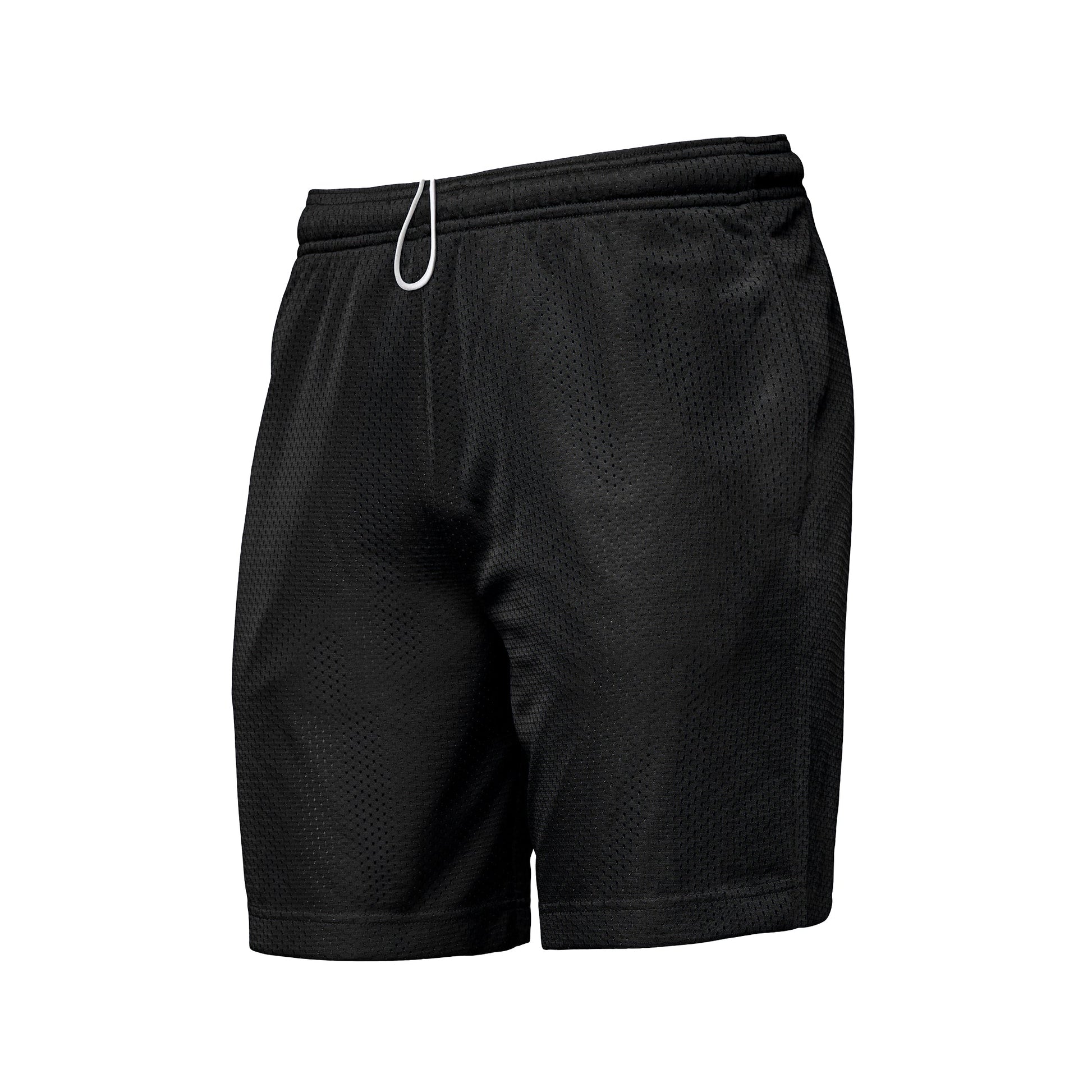 130 gsm - 3.8 oz/yd2 - 6.4 oz/lin yd 100% polyester open hole mesh with wicking and anti-bacterial finishes. Fully lined with polyester tricot knit. Made with unique cationic yarn and dye for easy printing. Elastic waistband with drawcord. Side seam pockets. Tear-away label.