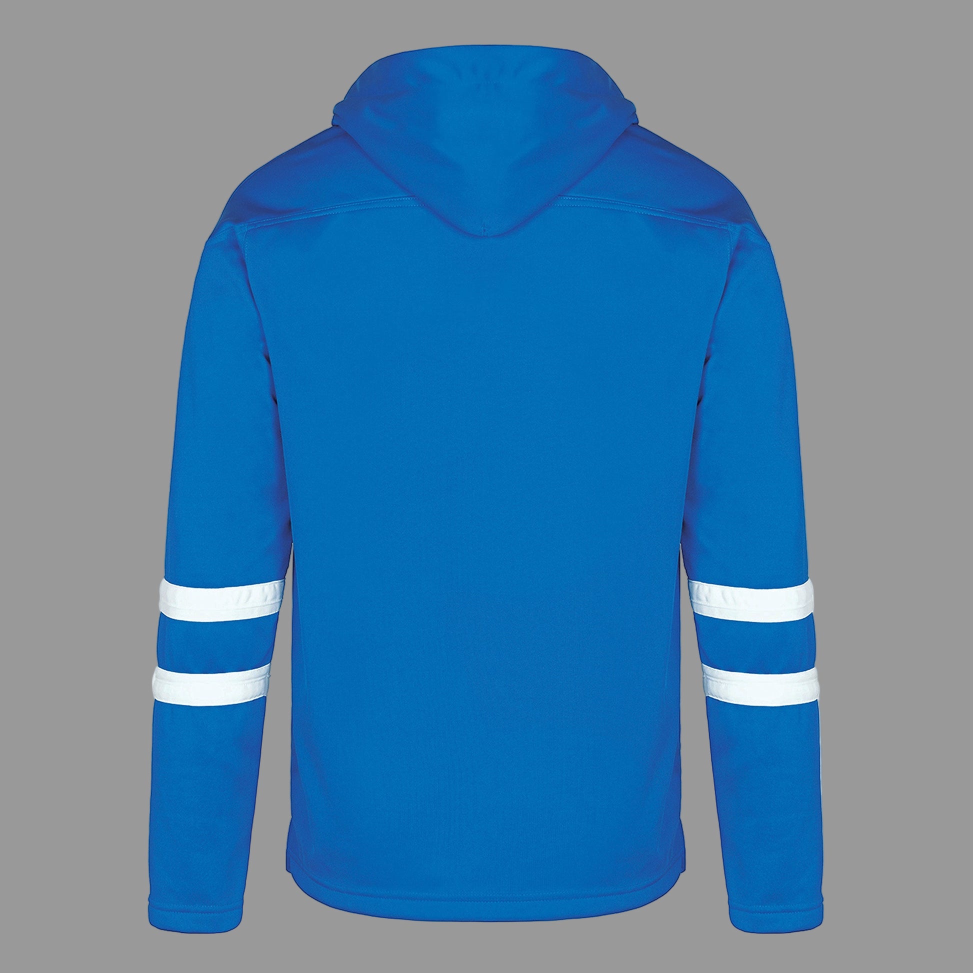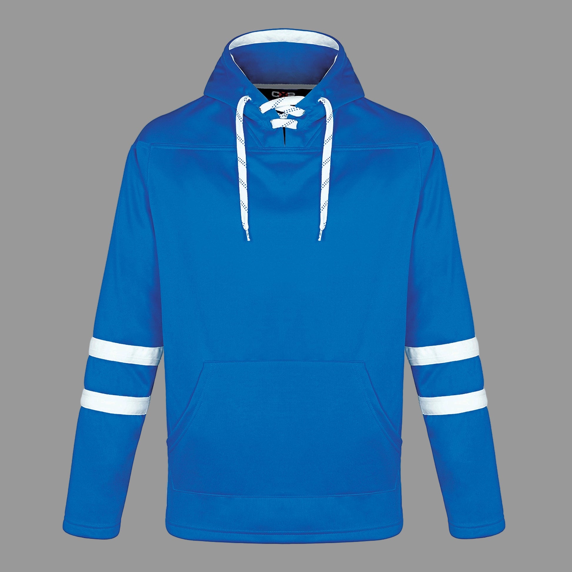 260 gsm – 7.7 oz./yd2 – 13 oz./lin. yd 100% polyester one side brushed fleece, anti-pill finish. Jersey lined hood. Kangaroo pocket. Contrast striping on sleeves and inside hood opening. Contrast taping at back neck and hem vents. Phone pocket hidden under kangaroo pocket. Adjustable hockey lace at neckline (not available on youth). Show your team spirit, additional hockey lace colours sold separately. V split hemmed body.