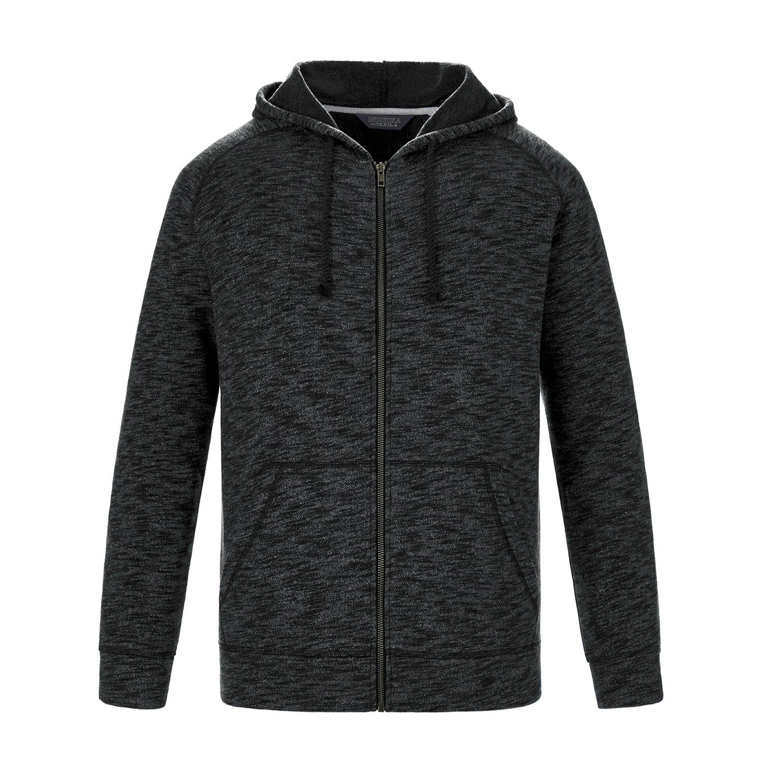 240 gsm – 7.1 oz./yd2 – 12 oz./lin. yd 60% cotton, 40% recycled polyester heathered brushed back French terry. Hidden under kangaroo pocket is a pocket with hook and loop closure. Adjustable drawcord in hood. Double layer self fabric cuff and hem. YKK zipper.