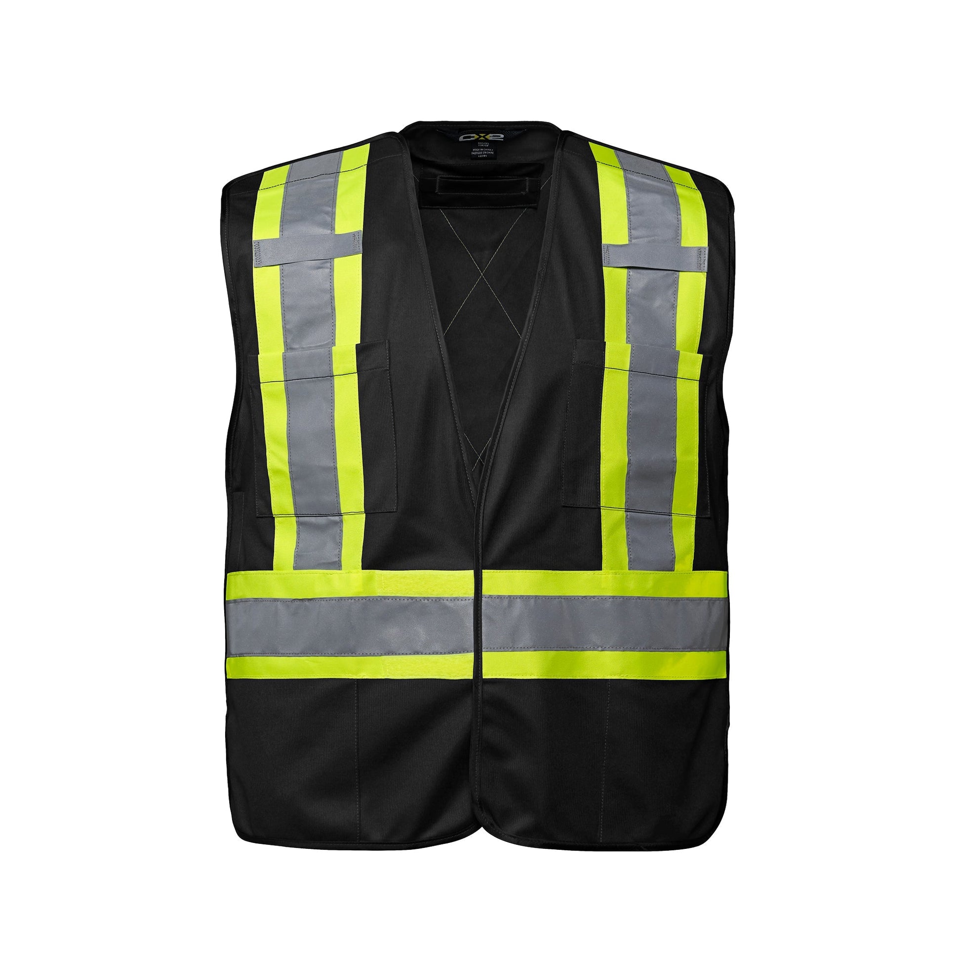 130 GSM - 3.8 oz./yd2 - 6.5 oz./lin. yd. 100% polyester tricot knit. 5-point tape fastener tear-away safety design. 4 front storage pockets. Reflective radio clip strap on front shoulders. Durable binding. D-ring access slot on back. 2" retroreflective stripe with 4" fluorescent background stripe on front and back body. Meets CSA standards.