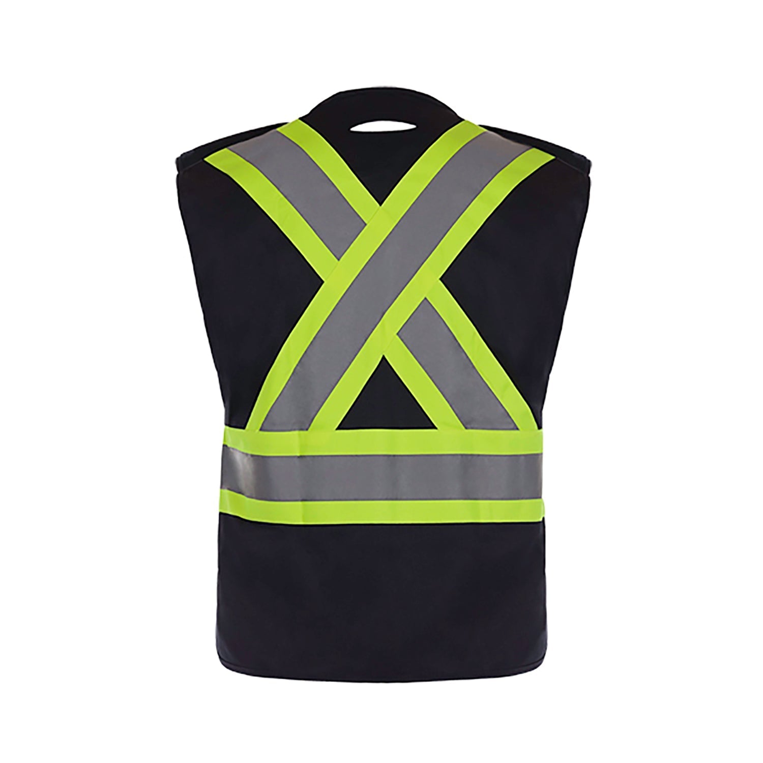 130 gsm – 3.8 oz./yd2 – 6.5 oz./lin. yd 100% polyester tricot knit. Upper left badge holder. 5 point tape fastener tear away safety design. 4 front storage pockets. durable binding. D ring access slot on back. 4” hi-vis contrast band with 2” reflective tape on front and back body. Meets CSA standards.