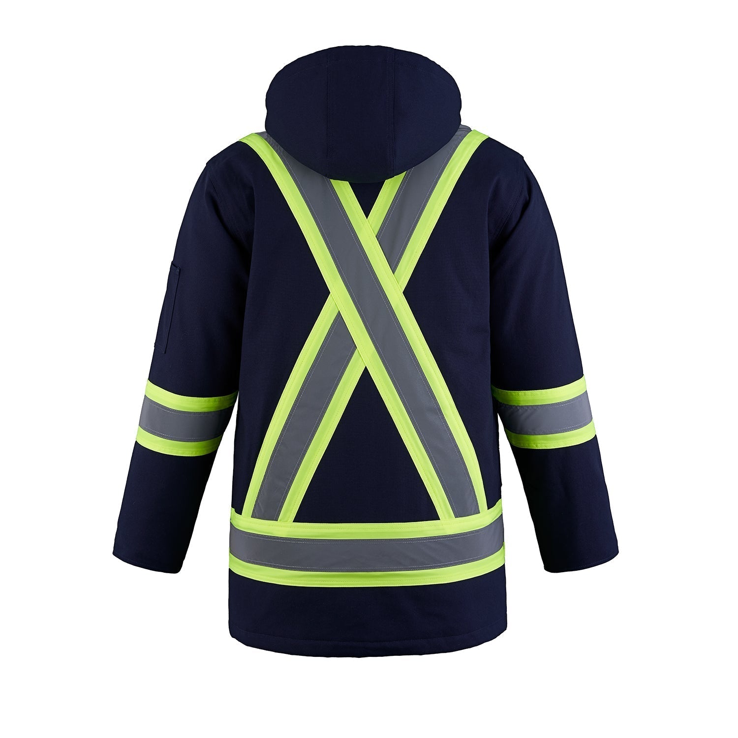 330 gsm – 9.7 oz./yd2 – 16.5 oz./lin. yd 100% cotton canvas with water repellent finish. Insulation: 220 gsm body, 170 gsm sleeves 100% polyester. Full body thermal quilted insulation. Snap detachable hood with adjustable drawcord. Rib knit storm cuff. 7 exterior pockets - 2 chest pockets, 2 side entry pockets, 2 lower front patch pockets with flap and 1 pocket on sleeve. Two interior pockets. YKK zipper. 4” hi-vis contrast band with 2” reflective tape on front and back body and sleeves. Meets CSA standards.