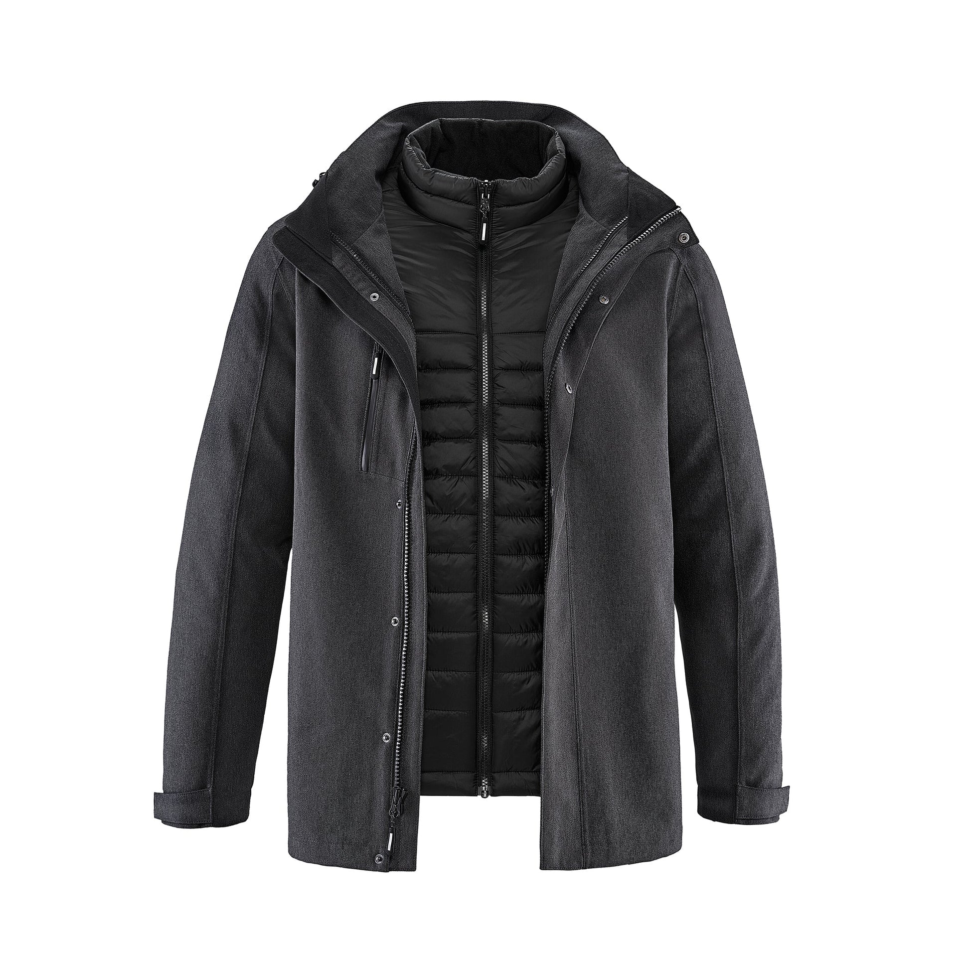 jacket fully seam sealed with waterproof, breathable coating. Zippered detachable hood with adjustable drawcord. Waterproof zippered chest pocket on wearer’s right. Zippered side entry pockets on lower front body. Adjustable hook and loop tabs on sleeve cuff. Drawcord at body hem on men’s style. Two inner pockets - one with zipper. Embossed print taffeta lining. Zocket embroidery access. Zip out insulated quilted inner jacket with water repellent finish. Brushed tricot inner collar. Zippered side entry pockets on lower front body. Elastic binding at cuff. One inner pocket. Embossed print taffeta lining. YKK zippers. Inner jacket is black on all color ways.