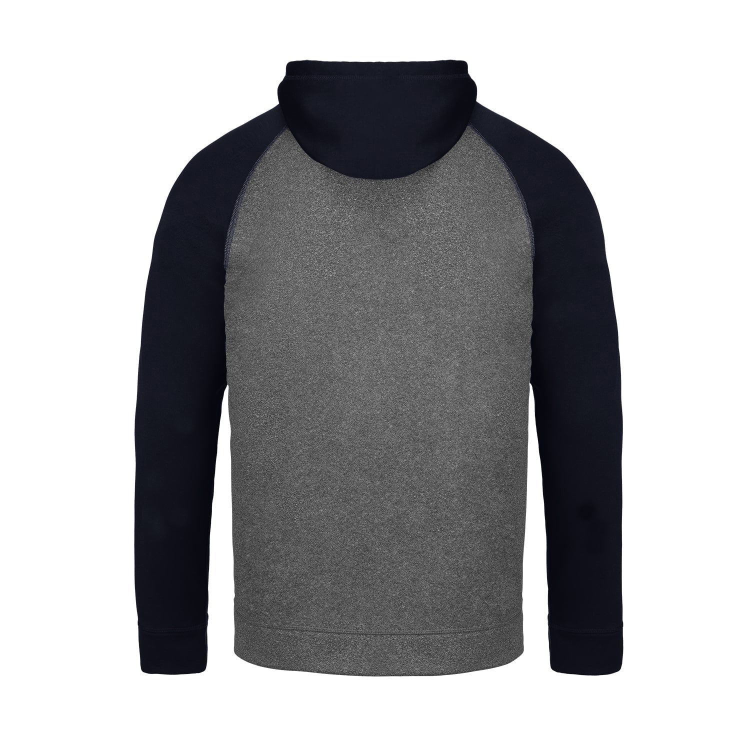 260 gsm – 7.7 oz./yd2 – 13 oz./lin. yd 100% polyester one side brushed fleece, anti-pill finish. 2 tone contrast chevron tape at back neck seam. Hidden under kangaroo pocket is a phone pocket with hook/loop closure. Adjustable dye to match flat draw cord. Double layer self fabric cuff and hem.