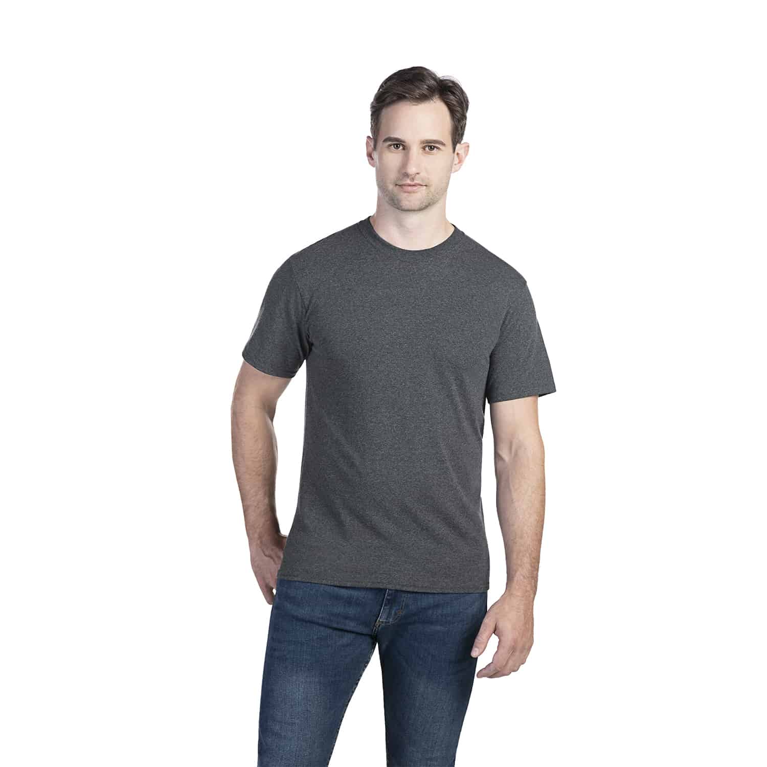 160 gsm – 4.7 oz./ yd2 – 8 oz./lin. yd (solids) 100% ring spun combed cotton jersey (heathers) 65% ring spun combed cotton, 35% polyester jersey. 30 single yarn. Rib knit neckline with spandex for shape retention. Jersey knit back neck and shoulder tape. Tear away label. DTG direct to garment printer friendly. Made in Bangladesh