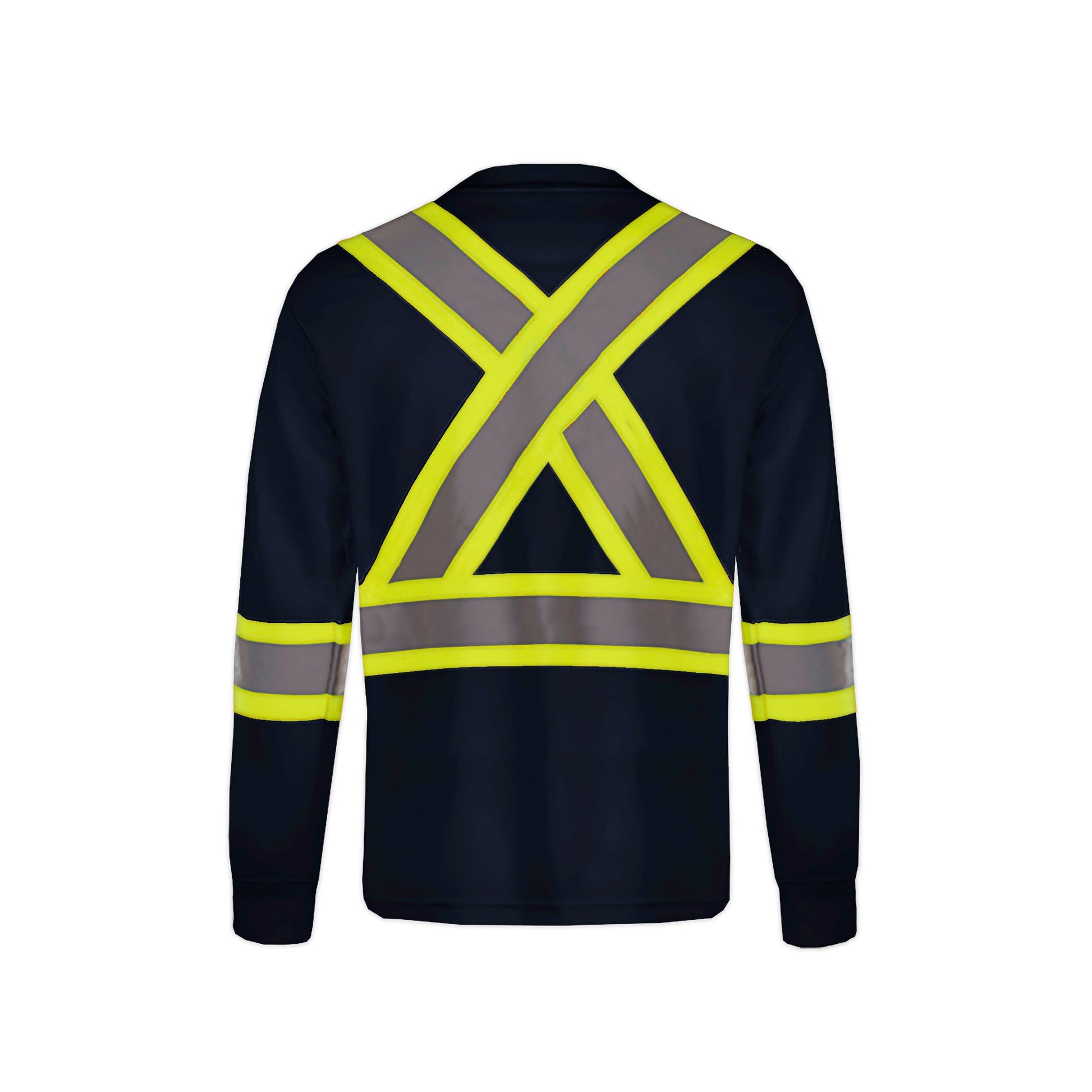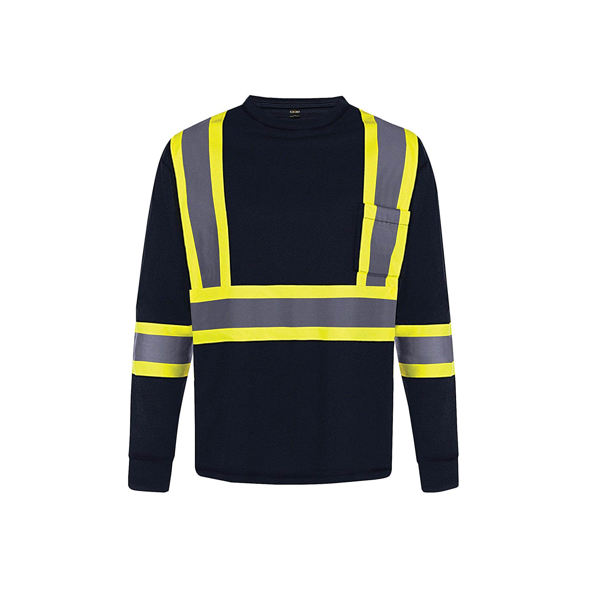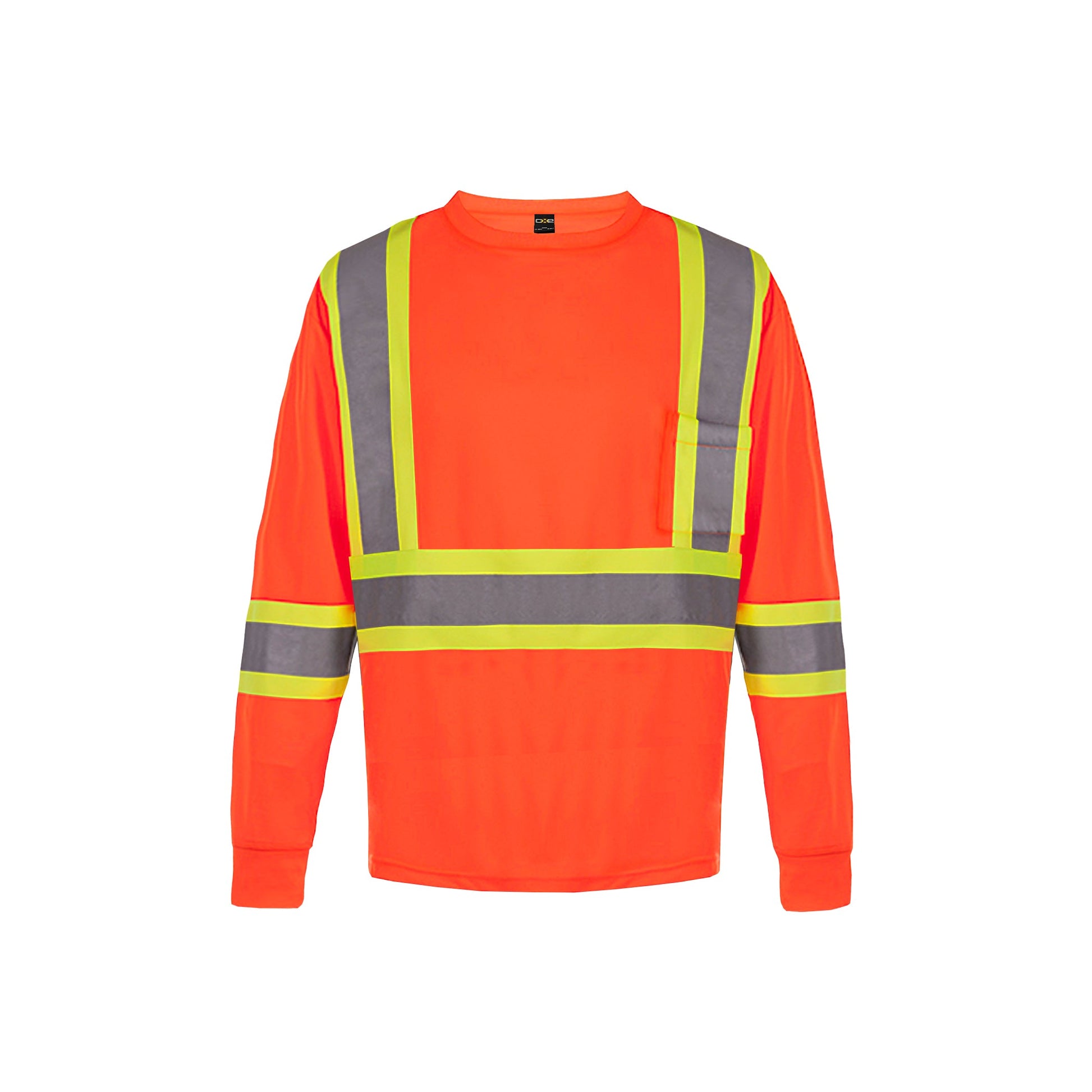 130 gsm - 3.8 oz./yd² - 6.5 oz./lin.yd 100% polyester birdseye mesh with wicking finish. Self fabric neckline. Rib knit cuff. Chest pocket. Tear away label. 4” hi-vis contrast band with 2” reflective tape on front and back body and sleeves. Meets CSA standards.