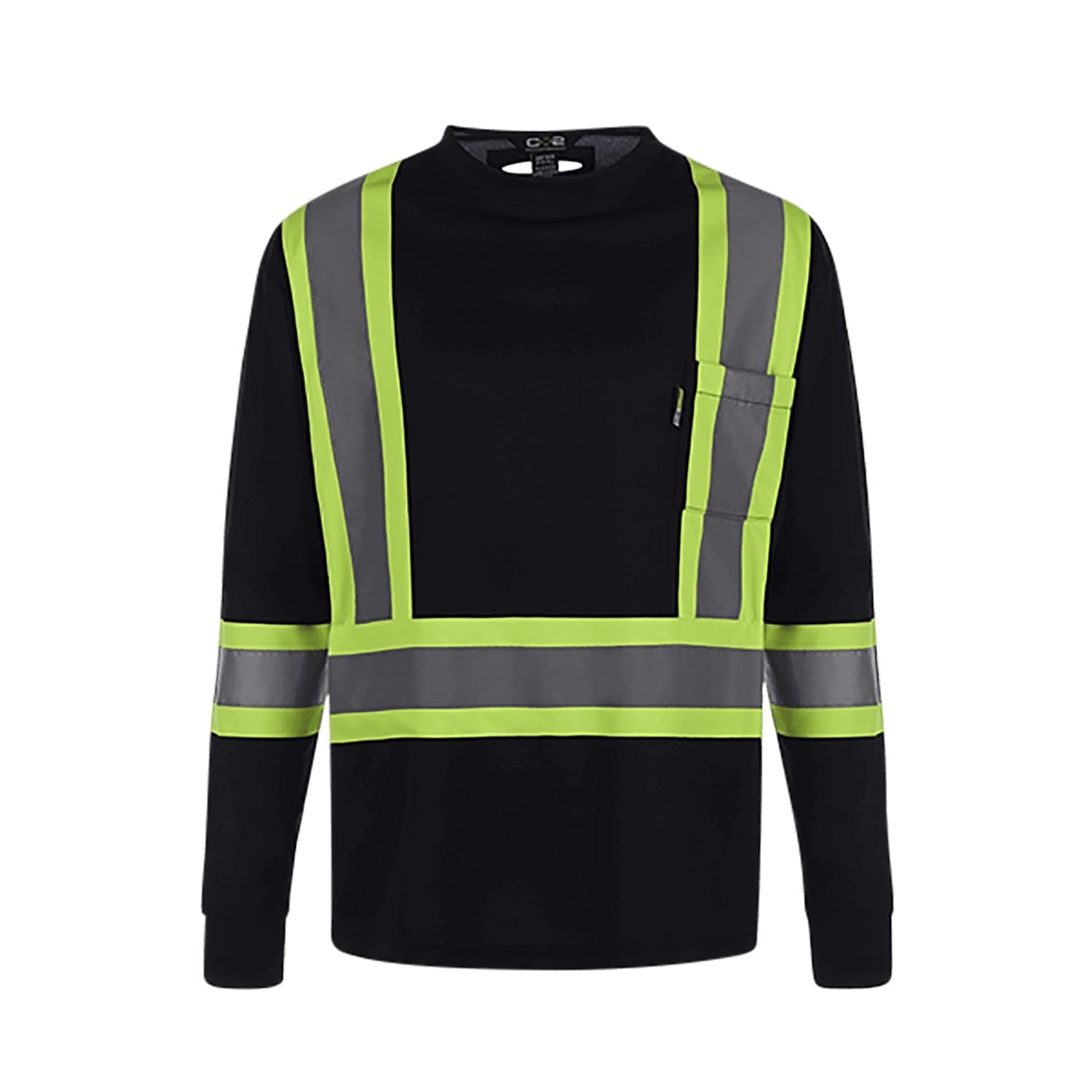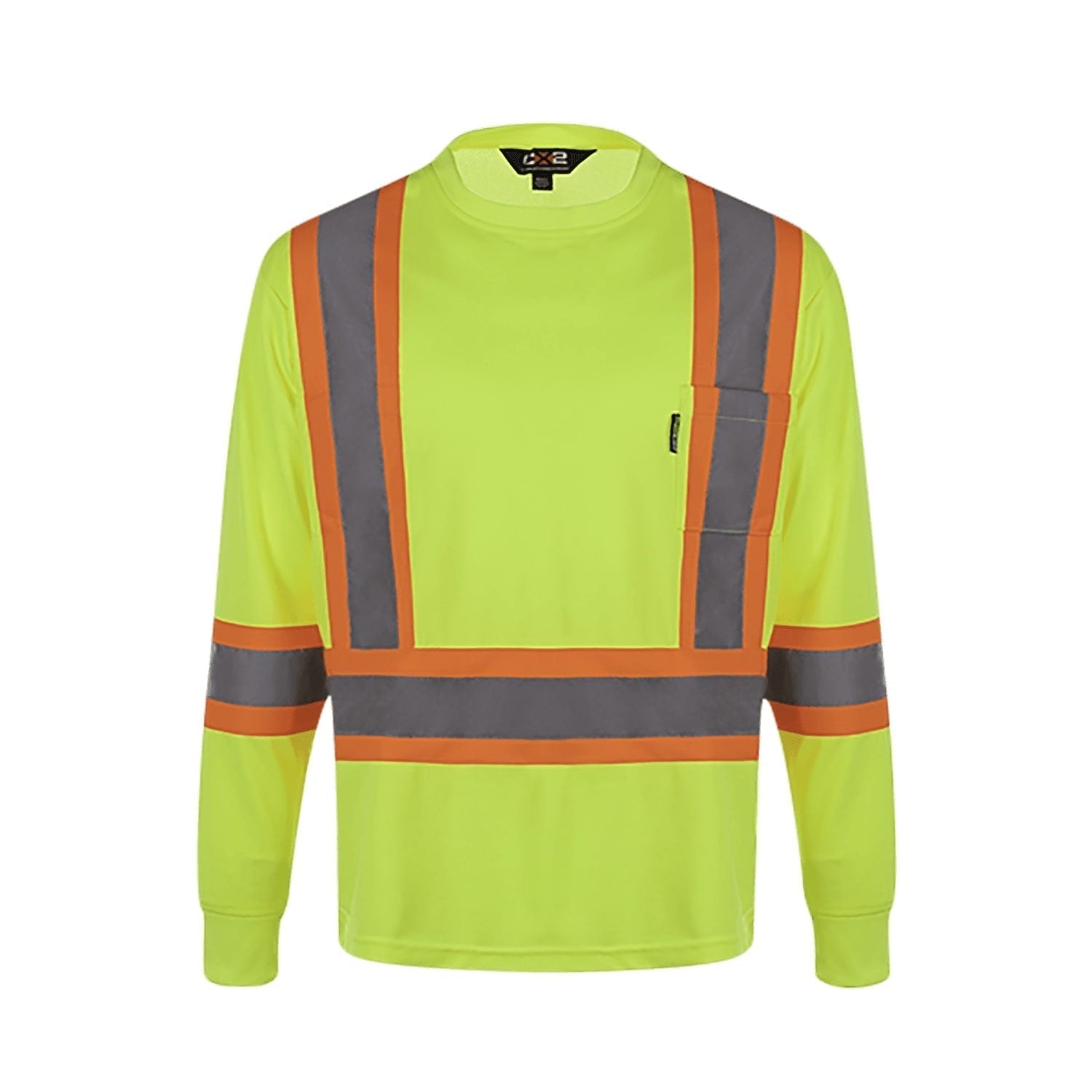 130 gsm – 3.8 oz./yd2 – 6.5 oz./lin. yd 100% polyester birdseye mesh with wicking finish. Chest pocket. 4” hi-vis contrast band with 2” reflective tape on front and back body and sleeves. Meets CSA standards.
