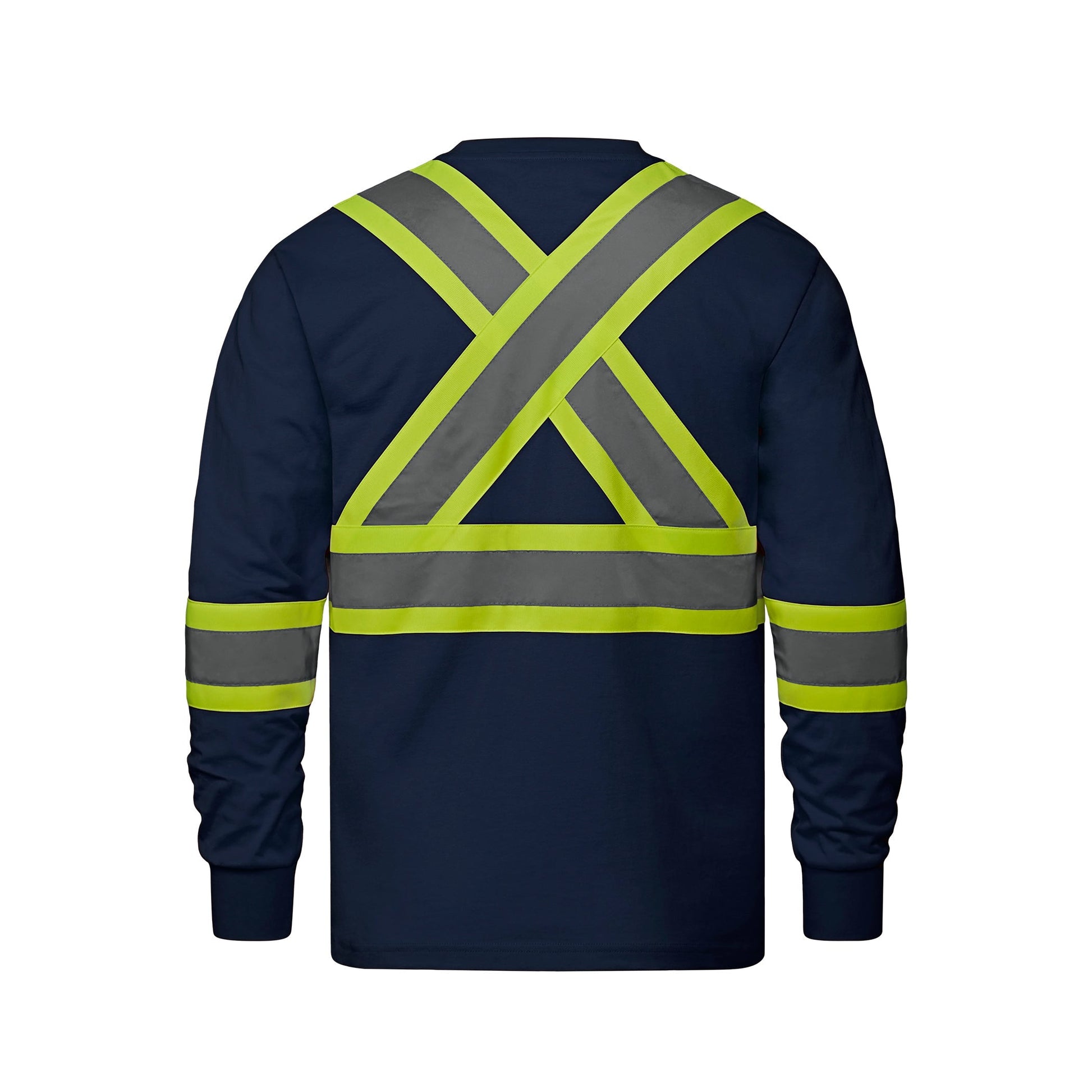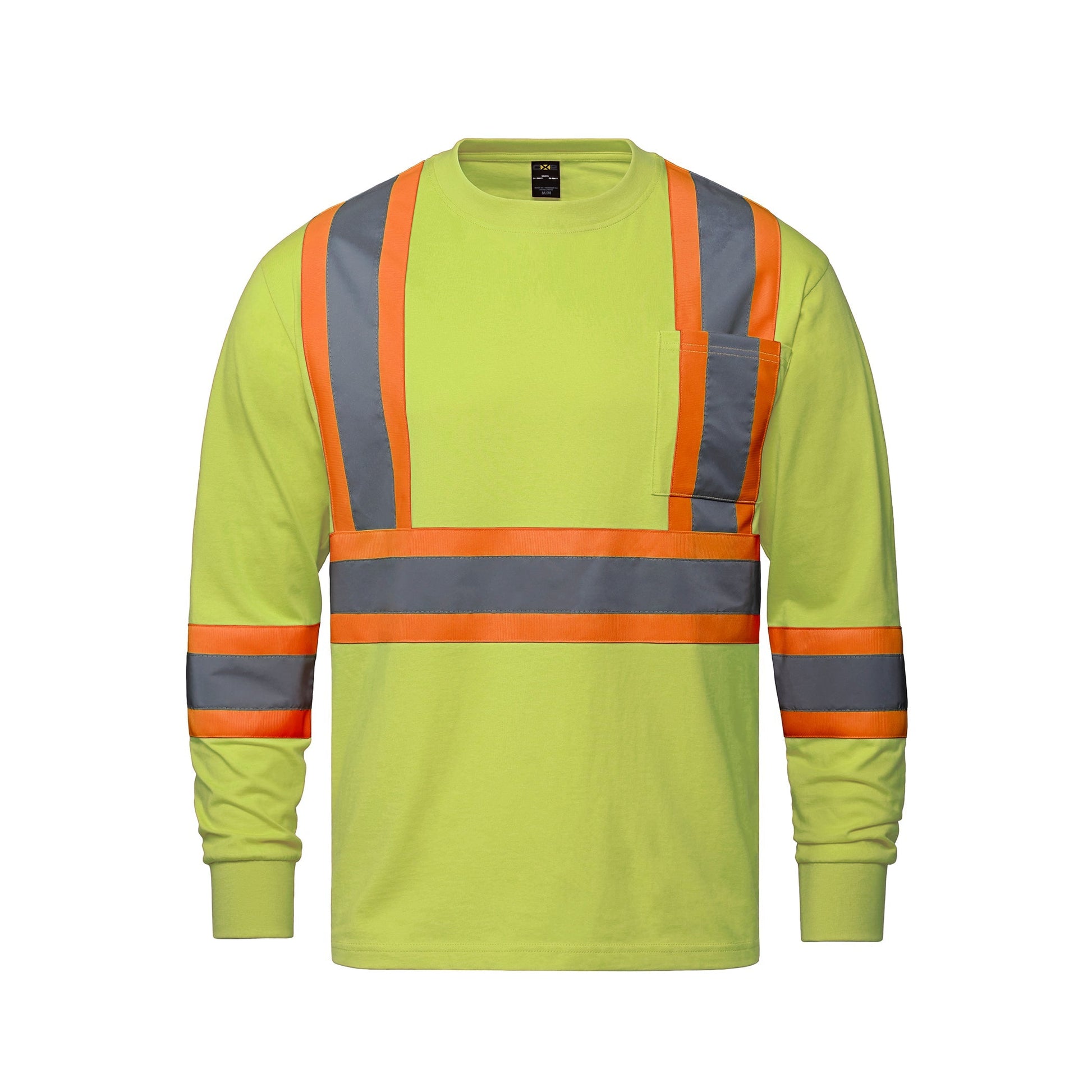180 GSM - 5.3 oz./yd2 - 9 oz./lin. yd. 100% cotton jersey. Rib knit neckline with spandex for shape retention. Chest pocket. 2" retroreflective stripe with 4" fluorescent background stripe on front and back body and sleeves. Meets CSA standards. Side seamed.